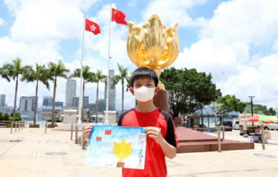 香港小学生曾祥珂带着自己的画作《敬礼——庆祝香港回归25周年》,在父母陪伴下来到金紫荆广场留影,迎接香港回归25周年。新华社记者 吴晓初 摄