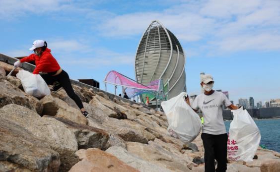 2021年12月7日,义工在香港海边捡垃圾。新华社记者吴晓初 摄