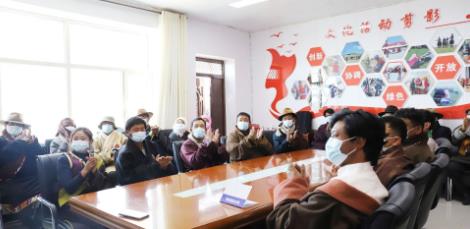10月16日,在青海省海北藏族自治州刚察县沙柳河镇果洛藏贡麻村,干部群众在收看中国共产党第二十次全国代表大会开幕会。新华社发(才藏吉 摄)