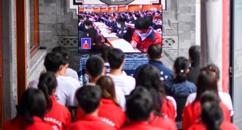10月16日,在云南省大理白族自治州大理市白族传统村落古生村,中国农业大学、云南农业大学等高校的老师、学生和村民在村中科技小院内收看中国共产党第二十次全国代表大会开幕会。新华社记者 江文耀 摄