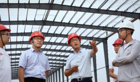 二十大代表、河南新乡市裴寨村党支部书记裴春亮(中)在村里了解产业园的建设情况(2022年9月8日摄)。新华社记者 李安 摄