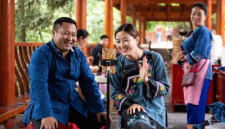 在湖南湘西十八洞村,十八洞村扶贫队长麻辉煌(左)与返乡大学生施林娇(中)一起直播推销土特产(2020年5月15日摄)。新华社记者 陈思汗 摄