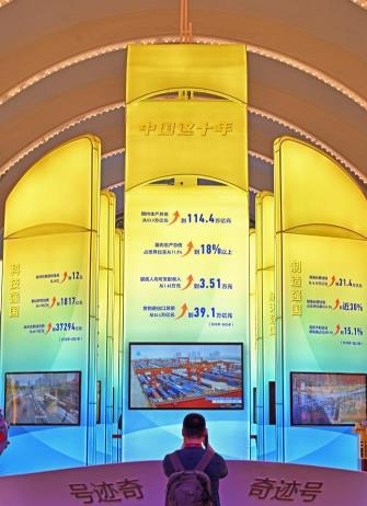 今年9月27日开幕的“奋进新时代”主题成就展上,一叶叶“成就”风帆拼成的中国经济“奇迹号”巨轮模型,引人关注。