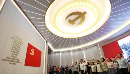 党员在上海中共一大纪念馆里重温入党誓词(2021年6月3日摄)。新华社记者 刘颖 摄