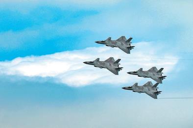 歼—20战机四机编队进行飞行展示。谭巳成摄(新华社发)