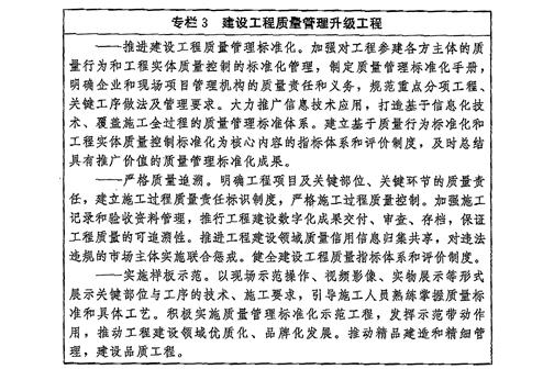 (十五)打造中国建造升级版。坚持百年大计、质量第一,树立全生命周期建设发展理念,构建现代工程建设质量管理体系,打造中国建造品牌。完善勘察、设计、监理、造价等工程咨询服务技术标准,鼓励发展全过程工程咨询和专业化服务。完善工程设计方案审查论证机制,突出地域特征、民族特点、时代风貌,提供质量优良、安全耐久、环境协调、社会认可的工程设计产品。加大先进建造技术前瞻性研究力度和研发投入,加快建筑信息模型等数字化技术研发和集成应用,创新开展工程建设工法研发、评审、推广。加强先进质量管理模式和方法高水平应用,打造品质工程标杆。推广先进建造设备和智能建造方式,提升建设工程的质量和安全性能。大力发展绿色建筑,深入推进可再生能源、资源建筑应用,实现工程建设全过程低碳环保、节能减排。