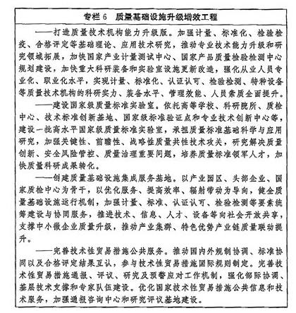 ——质量基础设施更加现代高效。质量基础设施管理体制机制更加健全、布局更加合理,计量、标准、认证认可、检验检测等实现更高水平协同发展,建成若干国家级质量标准实验室,打造一批高效实用的质量基础设施集成服务基地。