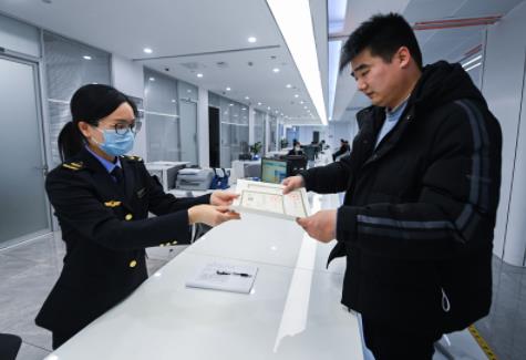 2023年2月8日,浙江省湖州市吴兴区,企业负责人在中小微企业一站式服务平台领取营业执照。