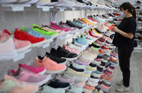 2022年5月16日,在福建省晋江国际鞋纺城,一家鞋材企业的销售人员在整理货架。