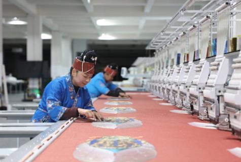2023年2月13日,贵州省黔东南苗族侗族自治州施秉县工业园区,工人在机绣车间作业。