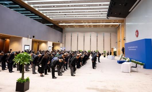 仪式约10时开始,全体人员肃立并奏唱国歌,之后默哀两分钟。香港特区行政长官李家超致献花圈,并带领出席人士行鞠躬礼。最后,李家超签署纪念册,其他出席人士随后逐一上前签署纪念册。