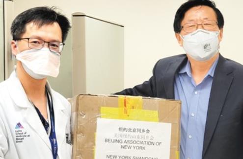 孙澜涛(右)代表北京同乡会将两千个口罩送到了疫情最严重的Elmhurst医院急诊室。(照片由受访者提供)