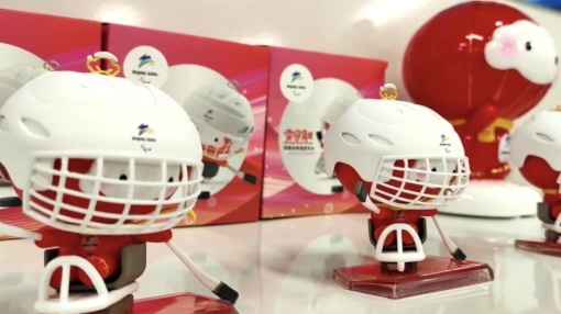 △冬奥村特许商品零售店内,冬残奥会吉祥物“雪容融”冰球运动文创产品亮相。(总台央视记者钟锋拍摄)