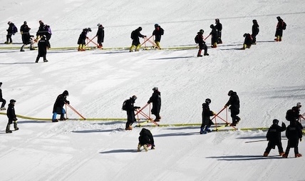 1月28日,工作人员在国家高山滑雪中心雪道上进行冰状雪制作。新华社记者张晨霖摄