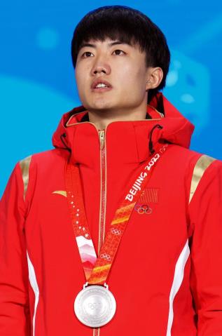 2月8日,亚军中国队选手李文龙在北京2022年冬奥会短道速滑男子1000米奖牌颁发仪式上。新华社记者鞠焕宗摄