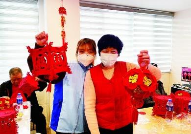 2月15日元宵节,陈伽萤(左)与三乡镇的群众展示制作好的灯笼。受访者供图