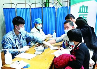 陈子翘(左一)在核酸检测点给老人和有高血压病史的群众量血压。受访者供图
