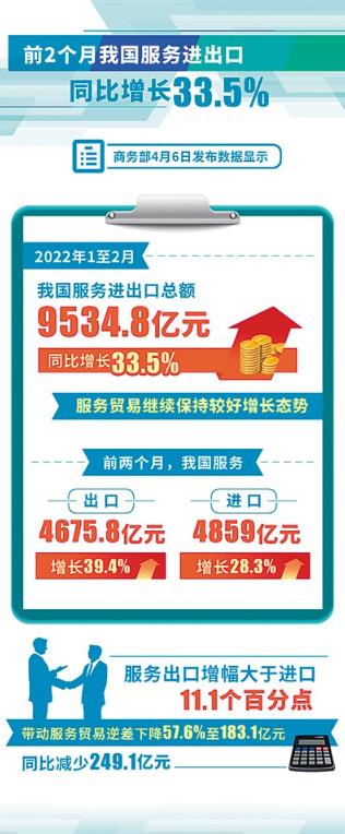 开年以来,中国服务贸易的表现备受关注。商务部公布数据显示,今年1—2月,中国服务贸易继续保持较好增长态势。其中服务出口4675.8亿元,增长39.4%,服务贸易逆差下降57.6%至183.1亿元,同比减少249.1亿元。