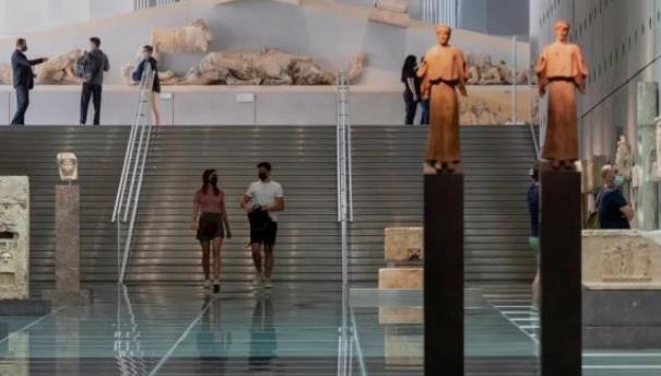资料图:当地时间2021年5月14日,希腊雅典,雅典卫城博物馆重新向公众开放。图为游客在博物馆开放第一天进入参观。