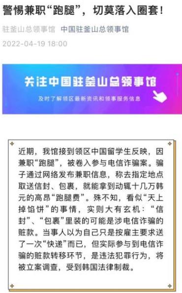 据中国驻釜山总领馆消息,近期就有中国留学生反映,因兼职“跑腿”,被卷入参与电信诈骗案。