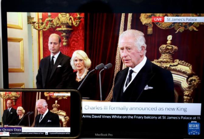 英国登基委员会10日在位于伦敦的圣詹姆斯宫正式宣告查尔斯三世为英国君主。这是在英国伦敦拍摄的查尔斯三世在圣詹姆斯宫发表讲话的直播画面。新华社记者李颖摄