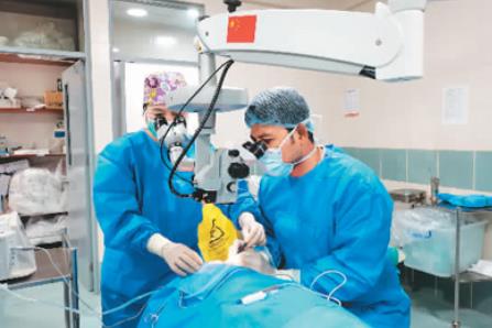 中方专家为当地患者做眼科检查。新华社记者 车宏亮摄