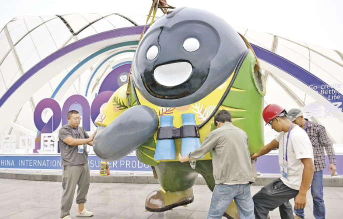第五届中国国际消费品博览会于4月13日至18日在海南举办。图为4月10日,工作人员在摆放消博会吉祥物。 新华社记者 郭程 摄