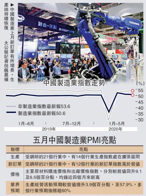 国家统计局数据显示,5月中国制造业PMI报50.6%,虽较前值微挫0.2个百分点,但仍优于市场预期,且已连续三个月稳定在扩张区间。国家统计局服务业调查中心高级统计师赵庆河介绍,上月制造业生产持续恢复,新订单增长的同时,价格指数亦现回升,但进出口指数仍处低位。受访专家认为,在中国内需持续回升,外部市场经济活动逐渐筑底背景下,未来中国制造业PMI料继续稳定在荣枯线上方。