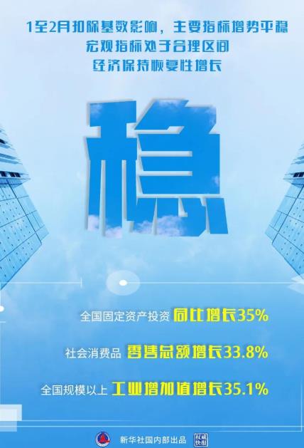 开年数据显示,今年中国经济保持恢复性增长。国家统计局15日发布数据,1至2月,全国固定资产投资同比增长35%,社会消费品零售总额增长33.8%,全国规模以上工业增加值增长35.1%。