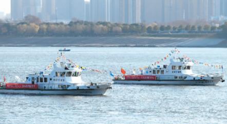 长江流域重点水域于2021年1月1日0时起正式进入“十年禁渔期”。图为渔政执法船队从长江武汉段江面驶过。新华社记者 程 敏摄