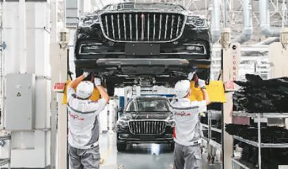 东北全面振兴不断迈出新步伐。图为7月1日工人在位于吉林长春的一汽红旗工厂总装车间内装配车辆。新华社记者 颜麟蕴摄