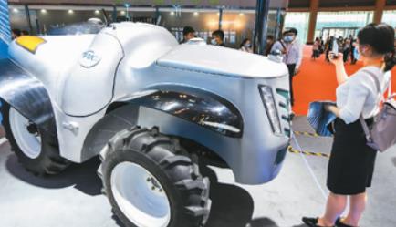 5月21日,观众在山西太原举行的第十二届中国中部投资贸易博览会上参观氢燃料电动拖拉机。新华社记者 曹 阳摄