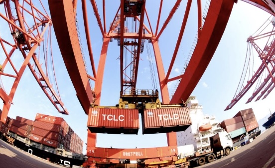 在江苏连云港港口码头,货轮进行集装箱装卸作业(2021年12月7日摄)。(新华社发,耿玉和摄)