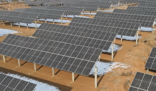 1月5日,电力工人在石家庄市灵寿县北谭庄乡北阳沟村附近的光伏电站巡查(无人机照片)。新华社记者 杨世尧 摄