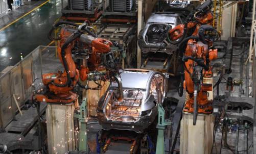 工业机器人在江淮汽车乘用车焊接车间生产线上工作(2月22日摄)。新华社记者 刘军喜 摄