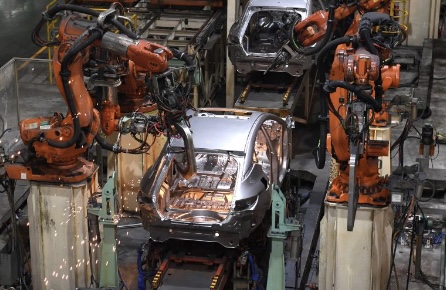 工业机器人在江淮汽车乘用车焊接车间生产线上工作(2月22日摄)。新华社记者 刘军喜 摄