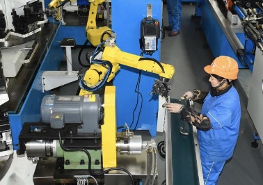 2月14日,浙江省湖州市吴兴区的一家企业,工作人员和智能机器人协作生产不锈钢管件。新华社记者 翁忻旸 摄