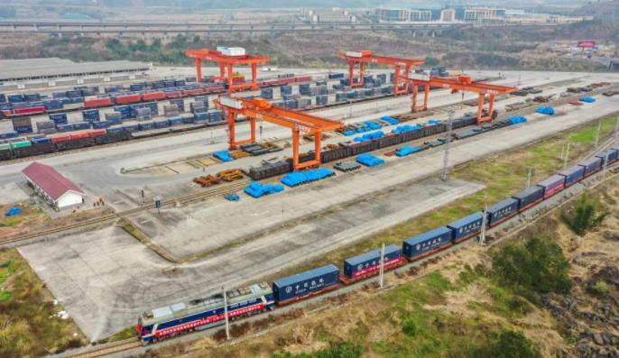 中老铁路(江津-万象)国际货运首发列车从重庆江津珞璜物流园片区的小南垭铁路物流中心驶出(3月2日摄,无人机照片)。新华社记者 唐奕 摄