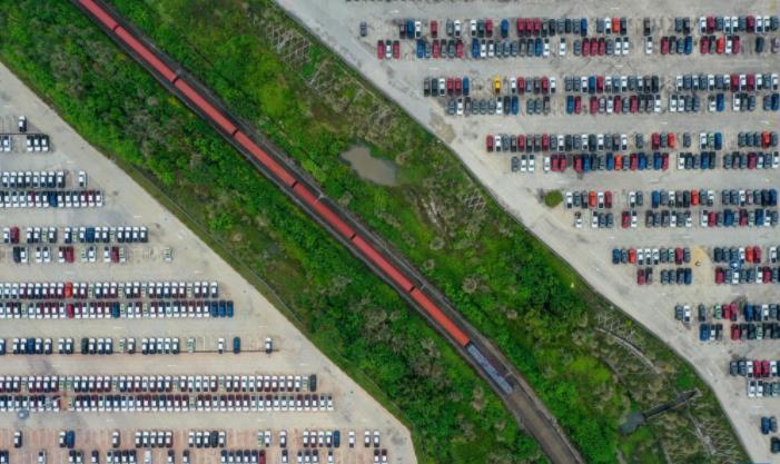 长城汽车专列首发列车在重庆永川国家高新区铁路专用线上(4月14日摄,无人机照片)。新华社记者 唐奕 摄