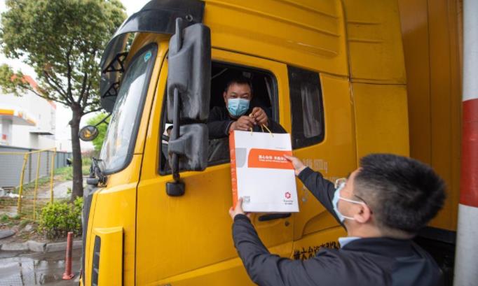 杭州传化公路港的工作人员在货车驶离公路港时为司机送上装满食品的礼包(4月13日摄)。新华社记者 江汉 摄