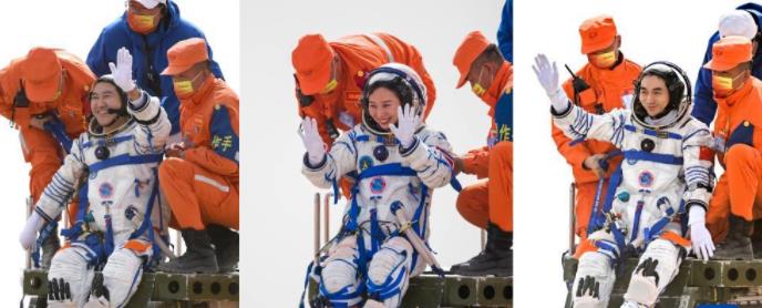 4月16日,神舟十三号载人飞船返回舱在东风着陆场成功着陆。这是航天员翟志刚、王亚平、叶光富(左至右)安全顺利出舱(拼版照片)。新华社发