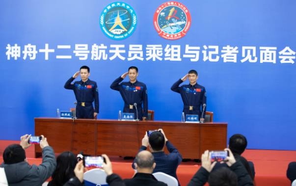 12月7日,在北京航天城举行的见面会上,神舟十二号航天员汤洪波、聂海胜、刘伯明(从左至右)敬礼致意。