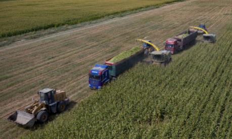 2021年9月3日,宁夏石嘴山市平罗县红崖子乡红瑞村的农民使用大型机械收获青贮玉米。(图片来源:新华社)