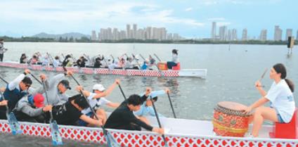 端午佳节来临之际,“龙腾虎跃”2022海峡两岸赛龙舟活动将于6月2日至3日在福建省厦门市举办。两岸41支参赛队的千余名选手将同台竞技,其中大陆队伍24支、台胞队伍17支。图为5月30日,集美大学龙舟队在厦门市水上运动中心训练。新华社记者 林善传摄
