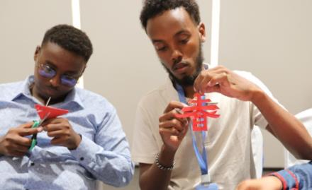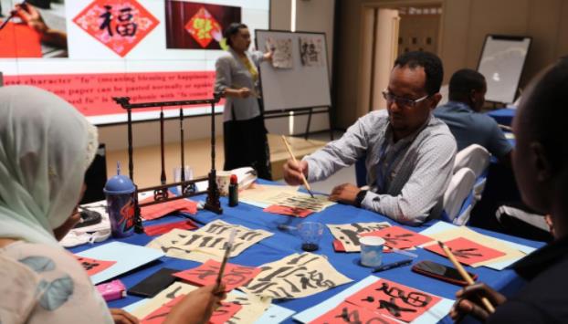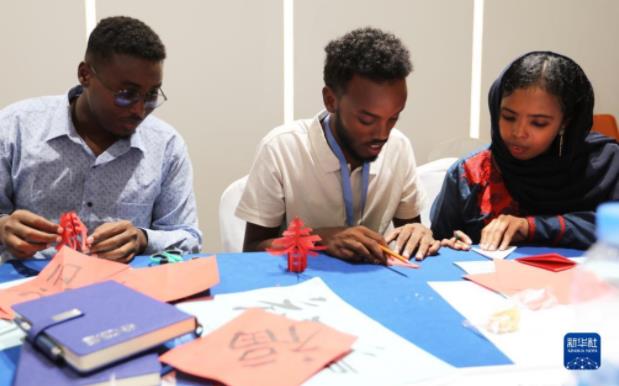当日,在吉布提非洲青年创新创业中心,吉布提孔子学院老师为来自吉布提、埃赛俄比亚、肯尼亚、乌干达的非洲创业青年上了一堂生动的中国文化课。风俗、书法、剪纸等中国文化引起了学员们的广泛兴趣。新华社记者 董江辉 摄