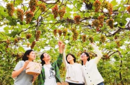 游客在山东省青岛市西海岸新区的一处葡萄园采摘。韩加君摄