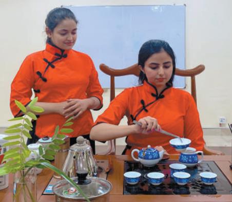 “这是历史悠久的中国品茶方式,茶汤清香四溢,品尝时先觉微苦后显甘甜。”身穿中式红色斜襟罩衫,巴基斯坦旁遮普大学孔子学院三年级学生谢海尔·贝诺在孔子学院开放日活动上,与同学们为来访的父母和朋友们奉上一杯中国茶,以中国式的礼仪表达了最热烈的欢迎。这是贝诺第一次向父母敬茶,她一边烫壶、泡茶、分杯,一边与父母分享品茶经验。中国自古就以礼仪之邦著称于世,中国茶注重礼仪和情谊,向父母敬茶意味着传承和回馈。“小时候在家里,总是母亲为我们煮茶。如今我很高兴自己能用另一种方式向母亲表达我的爱与感谢。”她说。