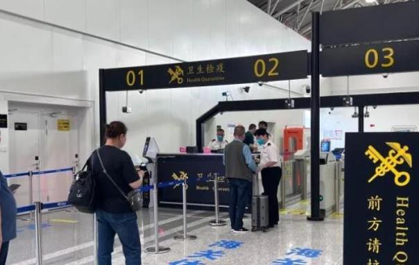 图为出境旅客有序通过智能验核测温一体机。