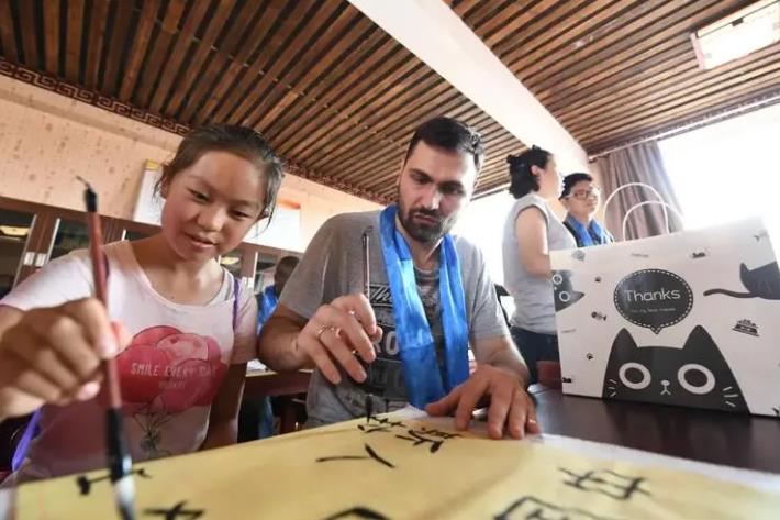 中国是茶的故乡、是茶文化起源地。茶叶也是中西方交流的载体之一。在当日的中国传统文化之旅中,茶艺师通过茶艺表演和解说,带着青少年们了解茶的泡饮过程、品茶的礼仪。室外烈日炎炎,在优雅的音乐中,中外青少年们举起手中茶盏,轻啜一口,白茶、乌龙茶……茶香沁人心脾。新西兰女孩Macama和美国女孩Olivia已经成为好朋友。她们十分开心地告诉记者,这是两人第一次来到中国,中国特有的“饮料”茶很好喝,虽然分不清白茶还是乌龙茶,但是中国的茶清香解渴,回味悠长。圣马力诺女孩Lena同样对茶“一见倾心”。她说,第一次品茶,品不同类型的茶,感觉很特别。