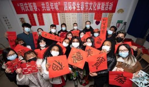 几张桌子拼成的大方桌上,留学生们正饶有兴致地尝试写对联、写“福”字。“活动很有意义,我很喜欢。”20岁的黄氏云来自越南,她向记者展示了刚写好的春联。“这是我第二年在中国过春节,中国的春节很喜庆,全家聚在一起吃年夜饭、贴春联、贴福、发红包。”